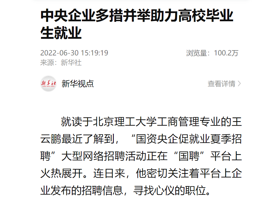 据相识,中央企业中智公司依托旗下中智招聘网平台克日启动了以高校结业生为服务工具的“2022夏日央企大型网络招聘活动”,国投集团所属国投人力公司也推出了“国资央企促就业夏日招聘”大型网络招聘活动,已经宣布岗位7.6万个,吸收简历11.2万份。(记者刘羽佳、王希)