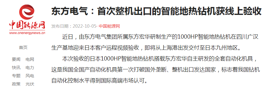 ±¾´ÎÑéÊÕµÄÈÕ±¾1000HPÖÇÄܵØÈÈ×ê»ú´îÔØ¶«·½ºê»ª×ÔÖ÷Ñз¢µÄÈ«Ì××Ô¶¯»¯»ú¾ß£¬ÕâÊÇÎÒ¹úÌìϲú×Ô¶¯»¯»ú¾ßµÚÒ»´ÎÍ»ÆÆÍâÑó¢¶Ï¡¢Õû»ú³ö¿ÚÅ¹ú¼Ò£¬±ê¼Ç×ÅÎÒ¹ú×ê»ú×Ô¶¯»¯¿ØÖÆË®Æ½»ñµÃ¹ú¼Ê¸ß¶ËÊг¡ÈÏ¿É ¡£