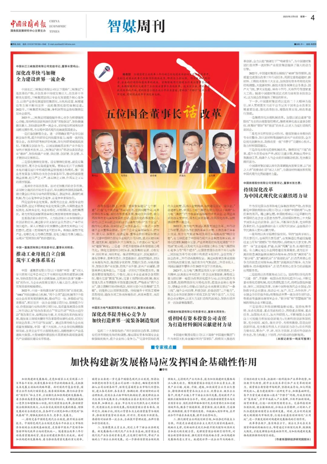作为刷新的践行者,企业的行动影响着刷新的效果。2月6日,中国经济时报约请五位国企董事长话刷新。ag百家家乐集团党组书记、董事长俞培根先容了集团公司以党的二十大精神为指引,坚决贯彻落实党中央、国务院决议安排,周全深化刷新,加速建设天下一流企业的相关情形。