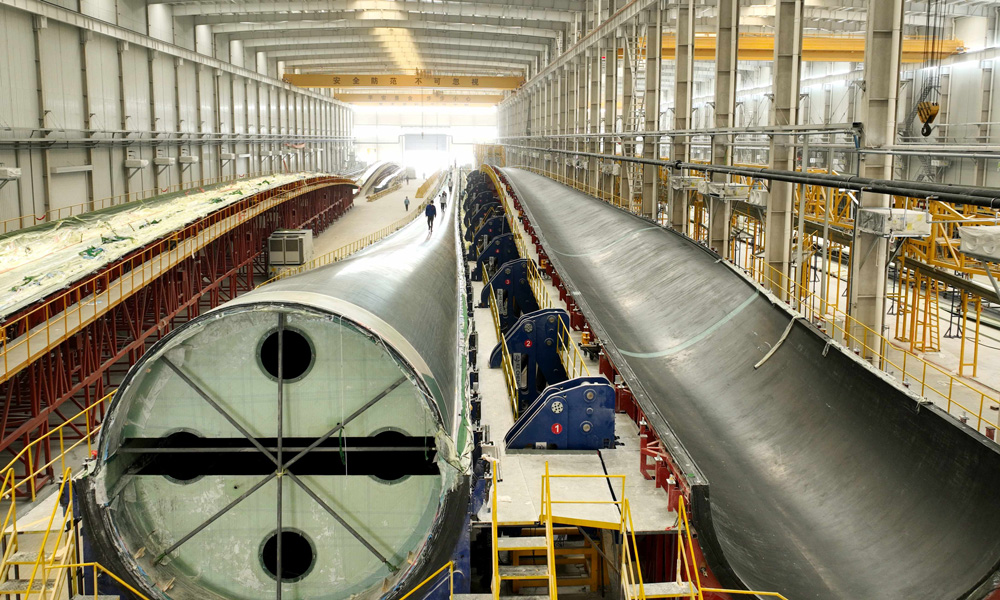 5月28日,ag百家家乐风电股份有限公司自主研制、拥有完全自主知识产权的B1260A型叶片,在江苏叶片制造基地顺遂下线,该叶片长126米,是现在全球已下线的最长风电叶片。同日,东方风电自主研制的B1200A型叶片一次性顺遂通过静力试验,各项测试指标与设计值优异吻合,120米级叶片的质料、结构、工艺及质量控制获得了充分有用验证。图为ag百家家乐B1260A型叶片下线现场。
