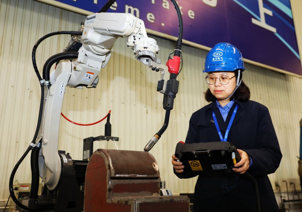天下人大代表曹天兰正在举行焊接机械人模拟试验 。贾伟明摄