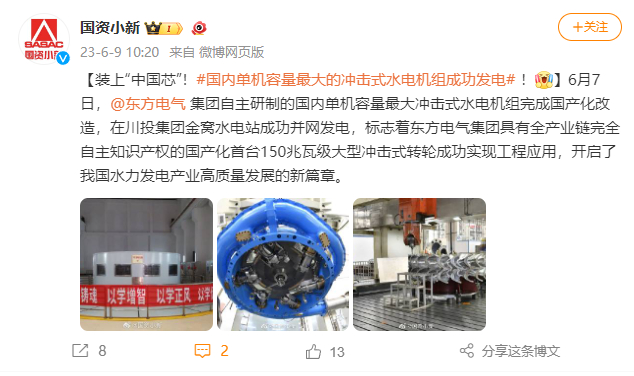 [国资小新]装上“中国芯”!#海内单机容量最大的攻击式水电机组乐成发电#