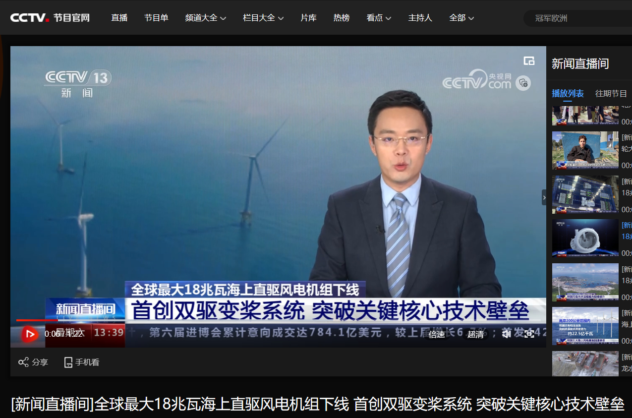 [央视新闻直播间]全球最大18兆瓦海上直驱风电机组下线 首创双驱变桨系统 突破要害焦点手艺壁垒