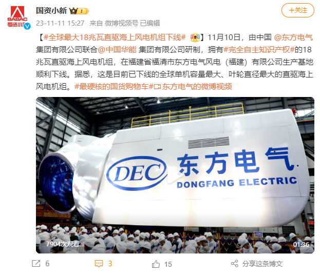 [国资小新]全球最大18兆瓦直驱海优势电机组下线
