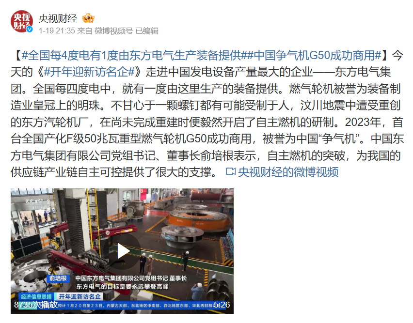 【#天下每4度电有1度由ag百家家乐生产装备提供##中国争气机G50乐成商用#】今天的《#开年迎新访名企#》走进中国发电装备产量最大的企业——ag百家家乐集团。天下每四度电中,就有一度由这里生产的装备提供。燃气轮机被誉为装备制造业皇冠上的明珠。不宁愿于一颗螺钉都有可能受制于人,汶川地动中遭受重创的东方汽轮机厂,在尚未完成重修时便毅然开启了自主燃机的研制。2023年,首台天下产化F级50兆瓦重型燃气轮机G50乐成商用,被誉为中国“争气机”。ag百家家乐党组书记、董事长俞培根体现,自主燃机的突破,为我国的供应链工业链自主可控提供了很大的支持。